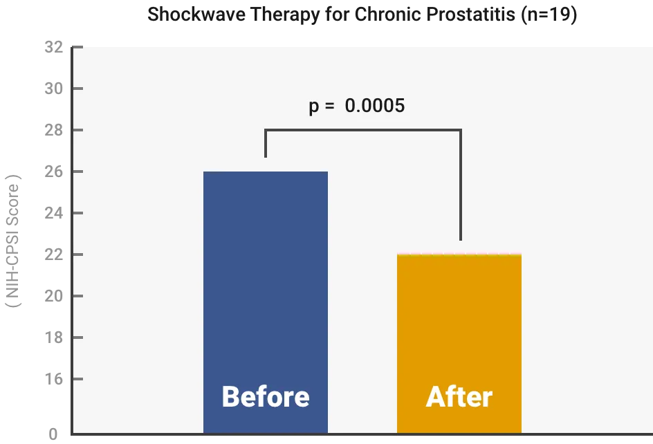 当院では本治療における臨床的なデータを集めてきました。慢性前立腺炎(CP/CPPS)患者様19名を対象にLi-ESWTを実施し、その結果、NIH-CPSIスコアが平均3.9ポイント改善(p=0.0005)しました。