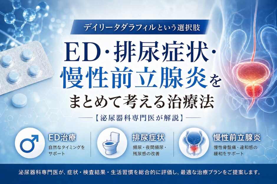 ED、排尿症状、慢性前立腺炎は、別々の病気に見えても、加齢・血流・自律神経・生活習慣と密接に関係していることがあります。泌尿器科で総合的に評価することで、より適切な治療選択肢を提案できます。